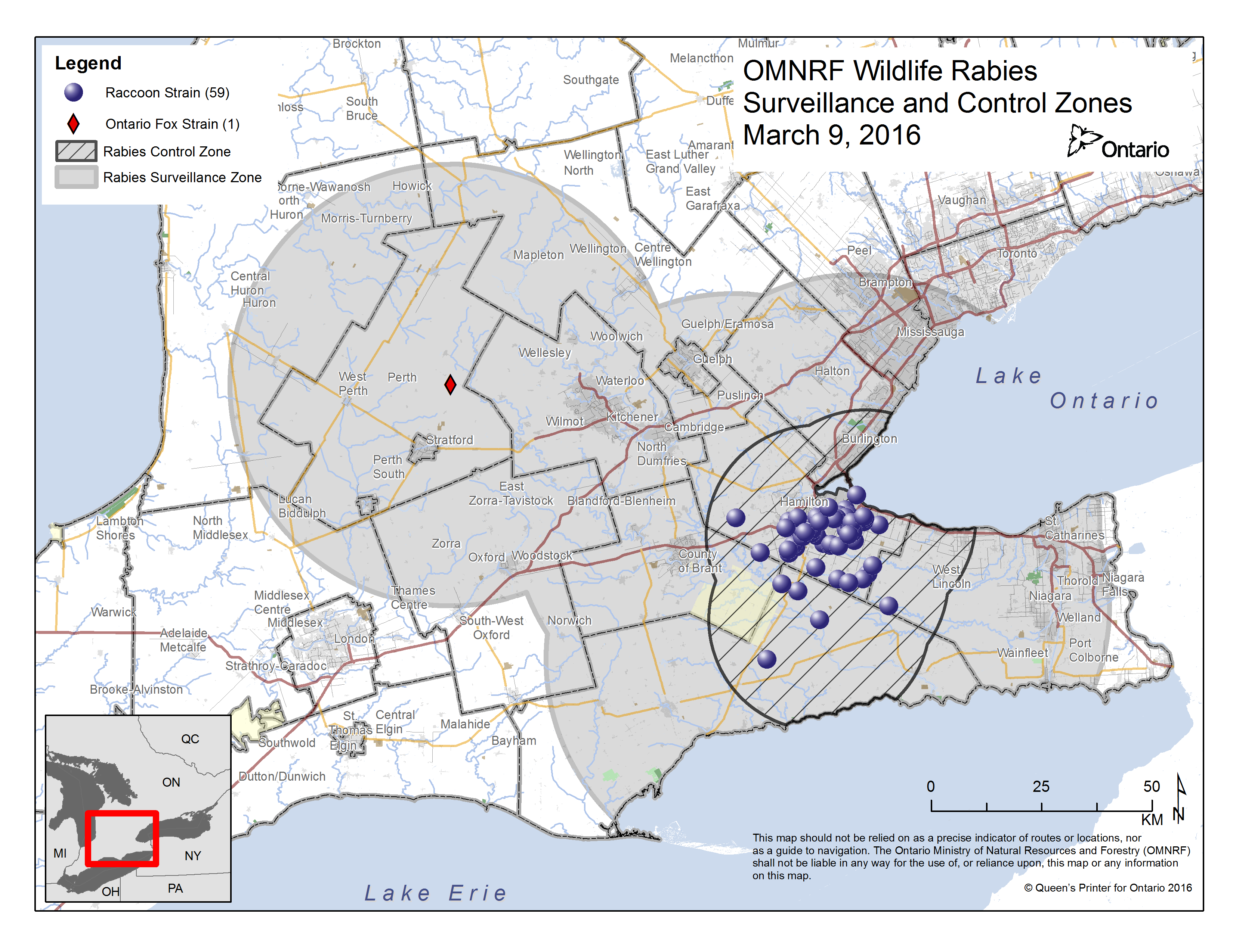 The MNRF is actively baiting. A 25 km radius around each occurrence was baited with vaccine-laced bait via plane, however the urban areas need to be baited by hand and this will take a bit longer. In April they will start baiting the 50 km radius area around the active cases found and in July they will start the whole process over again.